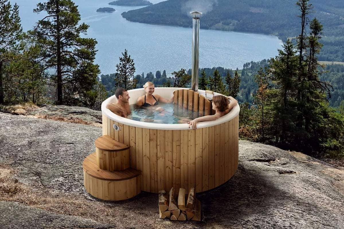 - Конструкція може бути з дров’яною піччю, або системою електронагріву води, встановленими як у самій дерев’яній ємності, так і винесеними назовні.