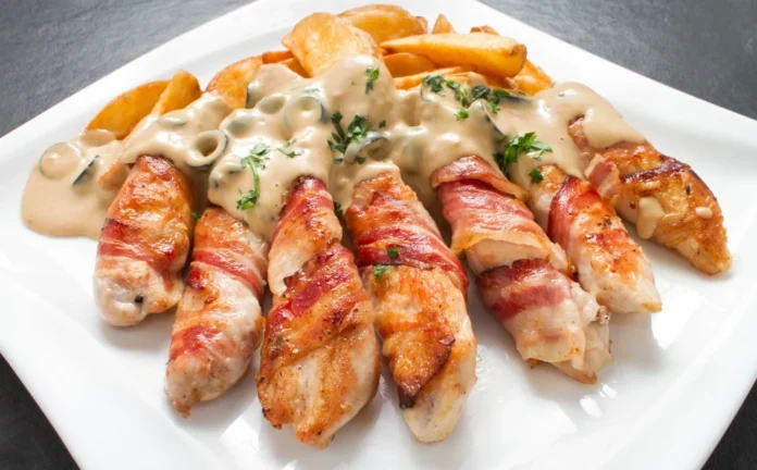 Нарізати філе довгими смужками, відбити, поперчити та посолити. Посипати шматочками сиром і згорнути їх у маленькі рулетики, а потім кожен обгорнути скибочкою бекону. Змастити|змазати| маслом|мастилом| і 25 хвилин|мінути| запікати в духовці при 180 градусах.
