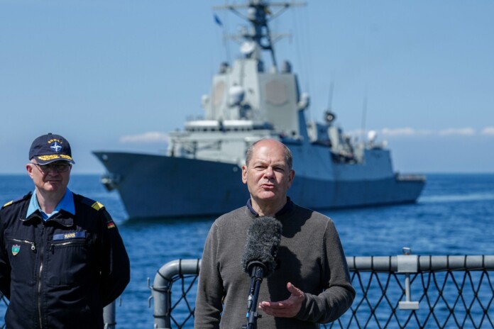 Шольца доставили на гумовій шлюпці до мінного тральщика бундесверу, щоб дізнатися про захист критично важливої інфраструктури на морському дні. Ця тема стала більш вибухонебезпечною у зв’язку з не розкритою атакою на газопровід «Північний потік-2» біля датського острова Борнхольм.