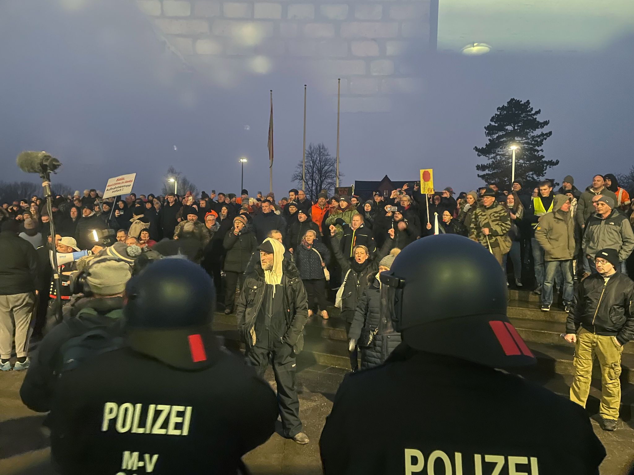 У четвер увечері 700 людей провели демонстрацію проти запланованого будівництва під час позачергового засідання районної ради у Гревесмюлені. Дехто намагався отримати доступ до непублічної частини зборів. На мітингу були присутні 120 співробітників поліції. На засіданні районна рада схвалила будівництво контейнерного притулку у селі Упал.