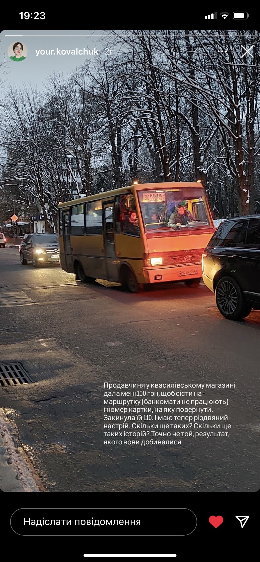 “Продавчиня у квасилівському магазині дала мені 100 грн, щоб сісти на маршрутку (банкомати не працюють) і номер картки, на яку повернути. Закинула їй 110. І маю тепер різдвяний настрій. Скільки ще таких? Скільки ще таких історій? Точно не той результат, якого вони добивалися”, – пише Юлія Ковальчук.