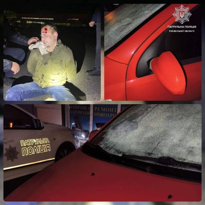 До приїзду патрульних ймовірного зловмисника вже затримав один із мешканців будинку. Нетверезий чоловік встиг пошкодити капот, дзеркала та номерний знак припаркованого авто Chevrolet Aveo. Рівнянин передав затриманого патрульним.