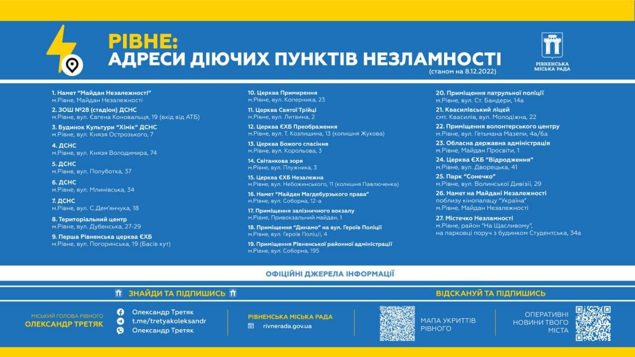 Збережіть собі список – і слідкуйте за повідомленнями, адже намети відкриватимемо і в інших районах, розповідає міський голова Рівного Олександр Третяк.