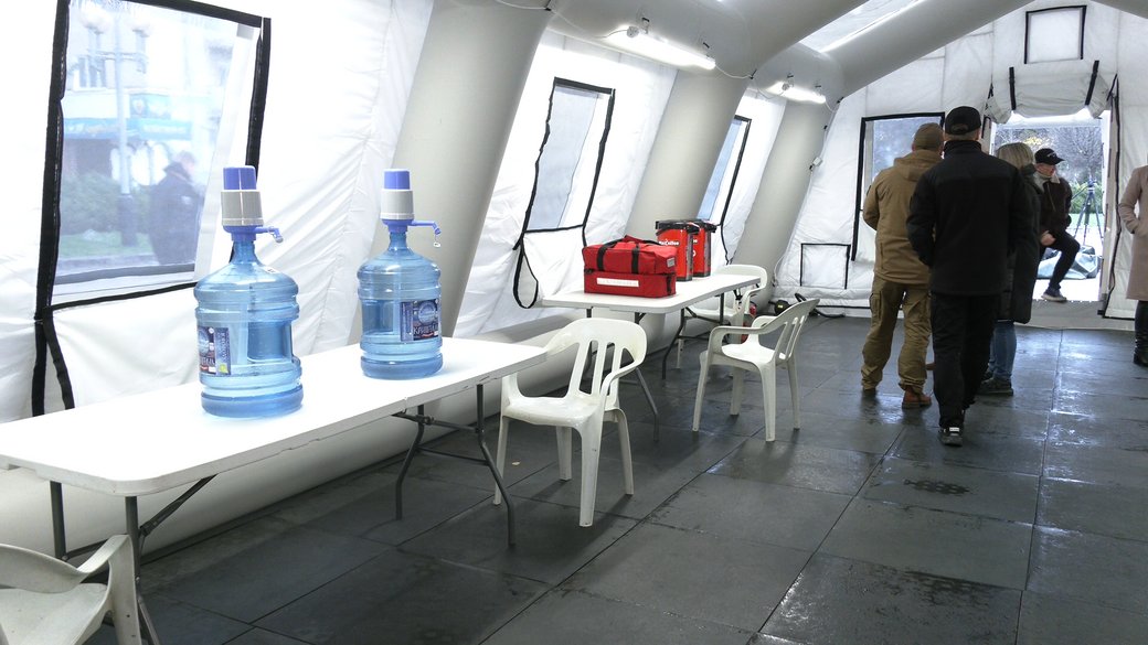 У наметі на майдані Незалежності чергуватимуть психолог, лікар та рятувальник. Повітря за допомогою теплової гармати прогріватимуть до 18-20 градусів, використовувати будуть генератори і пального для них закупили на цілу зиму, зазначили волонтери.