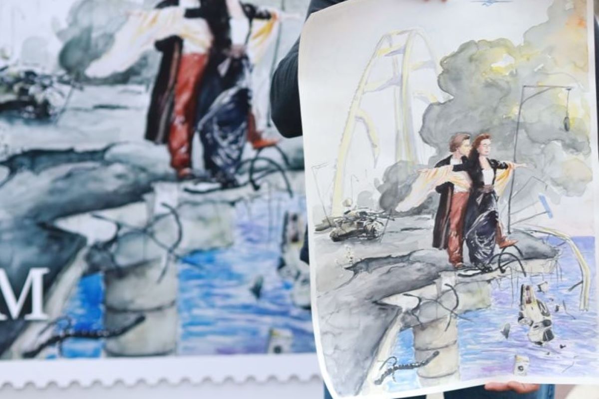 На малюнку зображено міст між Кримом та Росією, оповитий димом. На його тлі — культова сцена з блокбастера «Титанік», де Леонардо ДіКапріо та Кейт Уінслет стоять на носі корабля. Це посилання на заяву Росії про непотоплюваність мосту.