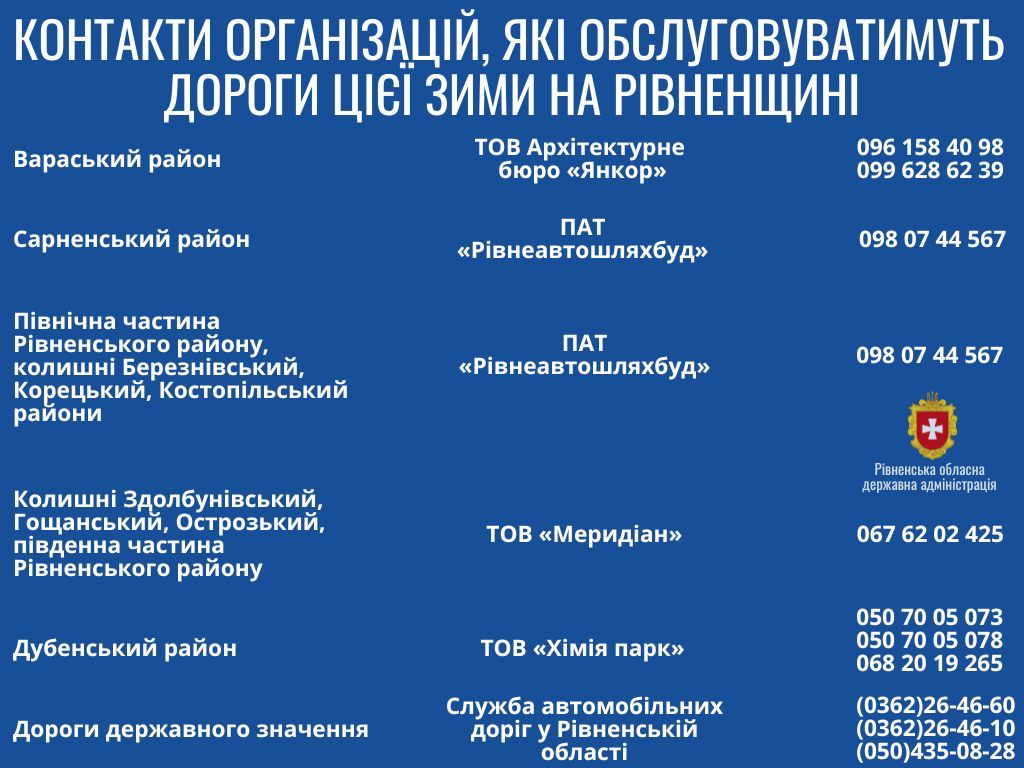 Телефони підрядних організацій, які цієї зими обслуговують дороги: