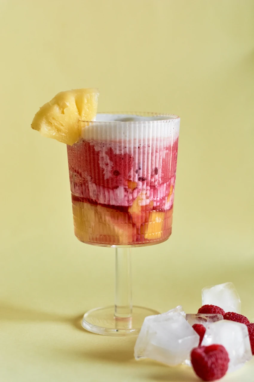 Приготування цього шаруватого коктейлю почні з нижнього шару – розкладіть по склянках кубики манго та ананаса. У шейкері або в іншому посуді змішайте ром і ананасовий сік, вилийте його на фрукти. Далі змішайте в блендері малину з кокосовим молоком та сиропом, налийте в келихи. Нагору за допомогою ложки налийте кокосове молоко, трохи перемішайте. Прикрасьте часточками ананаса і подавай.